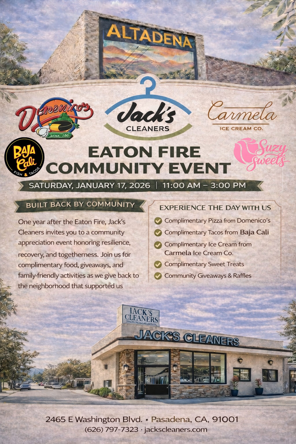 Join Jack's Cleaners for a ribbon cutting and celebratory event that is centered entirely around supporting our local community. After the Eaton Fire, many of our neighbors—including families, residents, and small businesses—were directly impacted. As a family-owned business rooted in this area, we wanted to create an opportunity not only for residents to come together, but also to uplift fellow local businesses who were affected. All of the complimentary food and drinks being provided are coming from nearby businesses in the area that experienced the impact of the fire as well. By bringing everyone together in one space, our goal is to support recovery, encourage connection, and help strengthen the local network that makes this community so special. Festivities kick-off at 11am with a ribbon cutting!